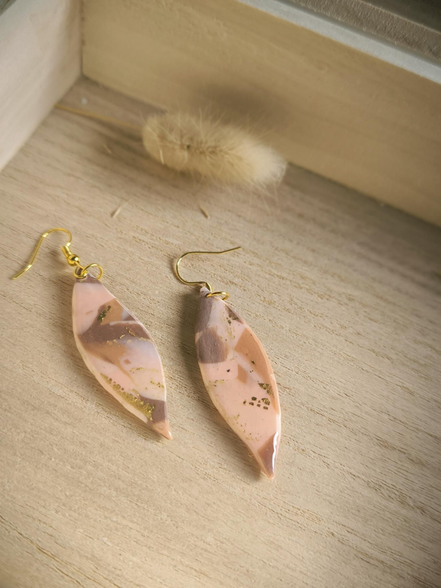 Matériau : Perles en pâte polymère faites à la main, aux motifs marbrés mêlant des nuances rosées et brunes, sublimées par des éclats dorés.